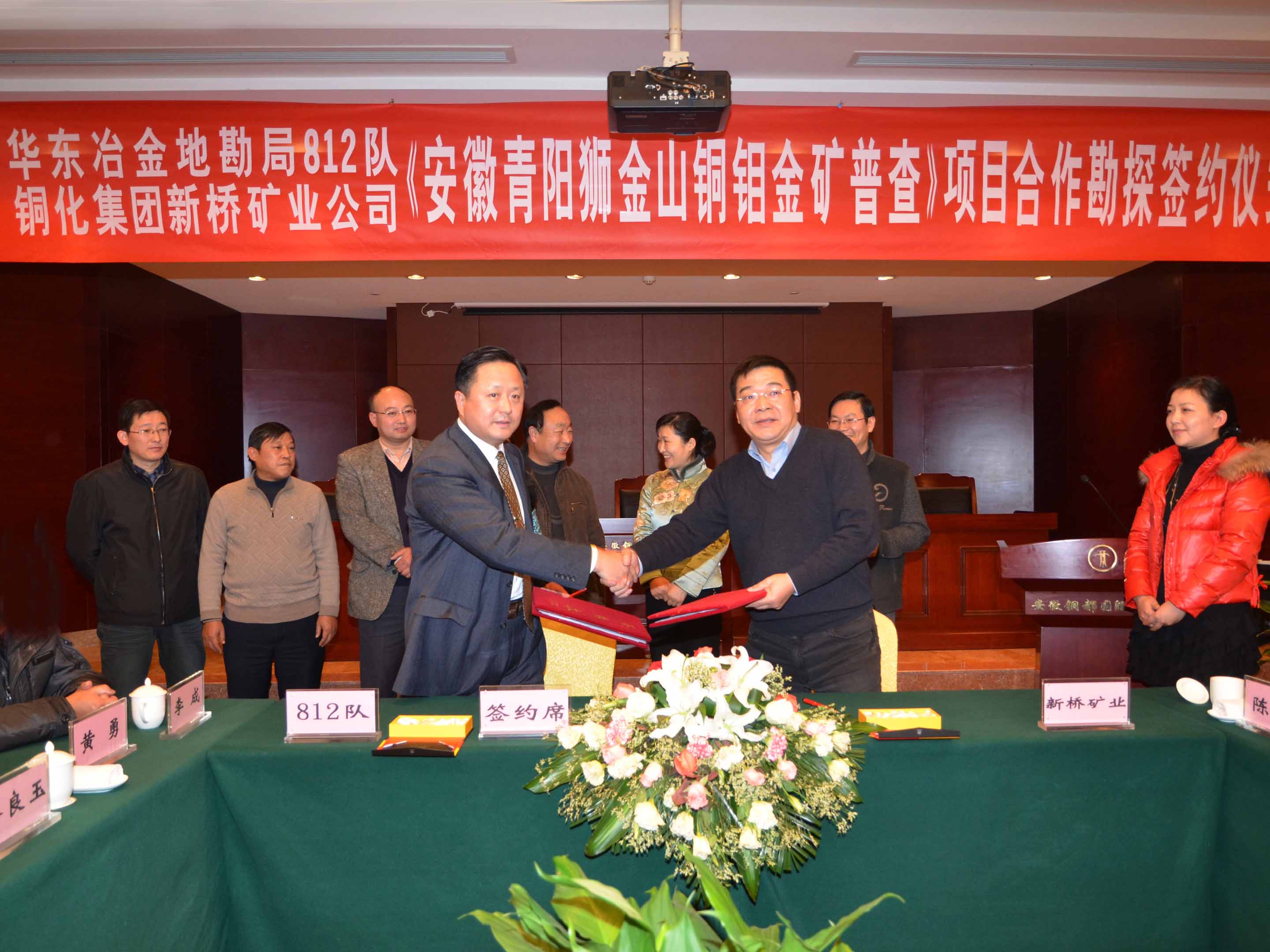 12月29日,队与铜化集团新桥矿业公司就《安徽省青阳县狮金山铜钼金矿普查》项目签定合作勘探协议,队长谭洪江与新桥矿业公司党委书记兼董事长钱玉贵分别代表甲乙双方签字。刘淮雪局长、局经营发展处处长黄勇、局地勘处处长杜怀玉与队领导,铜化集团副总经理李霞,新桥矿业公司领导班子共同出席签字仪式。
