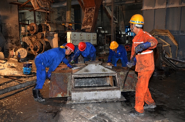 此次我方承担的六国化工大修设备检修,主要任务是磷铵二车间大块破碎机,干燥窑,溜槽,皮带等腐蚀设备的维修更换,尤其是关健设备直径8米多的干燥窑头部压皮更换,尾部格栅修复,拆除安装难度之大,责任之重前所未有。加上连续高温酷暑,厂部抽调了班长、技术骨干、党团员组成突击组,聘请了技术一流的铆焊工,陆胜利厂长每天驻守工地协调指挥,累得嗓子都哑了,技术骨干如钳工组组长党员闵万荣,每天工作十几小时,厚重工作服汗湿透了,大家精诚团结,全力以赴,目标只有一个----圆满高效完成任务。