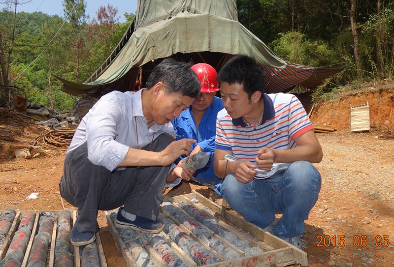 蒋其胜总工(左)在野外勘查岩心