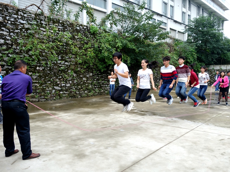 人气最旺的要属今年新增加的多人跳绳比赛,比赛实行抽签决定先后顺序,参赛每队出场队员8人(2人摆绳、6人跳绳)其中男队员不少于4人,以6人齐跳开始计数,不足6人不计数。共3次机会,以最好成绩评比。参赛队员各个精神抖擞,团结一心。比赛开始前,各队就已经摩拳擦掌,相互较劲。随着主裁判一声令下,紧张激烈的比赛正式开始,参赛队员们之间配合默契,认真谨慎,虽然中途偶有失误,个别队员会被绳子绊住,但会立即调整状态,继续比赛。裁判们认真、仔细的监督比赛,并进行成绩统计。最终,该机关分队以强大的实力荣获多人跳绳比赛冠军。地勘分院分队、物业公司分队分获二、三名。在篮球场的另一侧投篮比赛也井井有条的进行着,参加投篮比赛的职工们也个个满载而归。