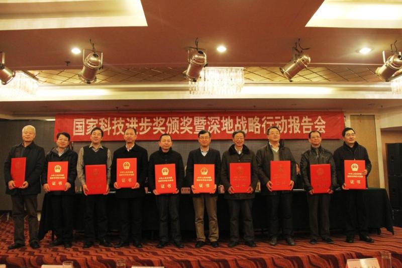 1月9日,中共中央国务院隆重举行国家科学技术奖励大会,共279个项目分别获国家自然科学奖、国家技术发明奖以及国家科学技术进步奖。我局参与的“大别山东段深部探测与找矿突破”项目荣获国家科技进步二等奖。 1月18日,省国土资源厅在合肥举行国家科技奖颁奖典礼,局首席科技专家蒋其胜作为该项目主要完成人之一接受颁奖。局总工高道明代表局上台领奖。