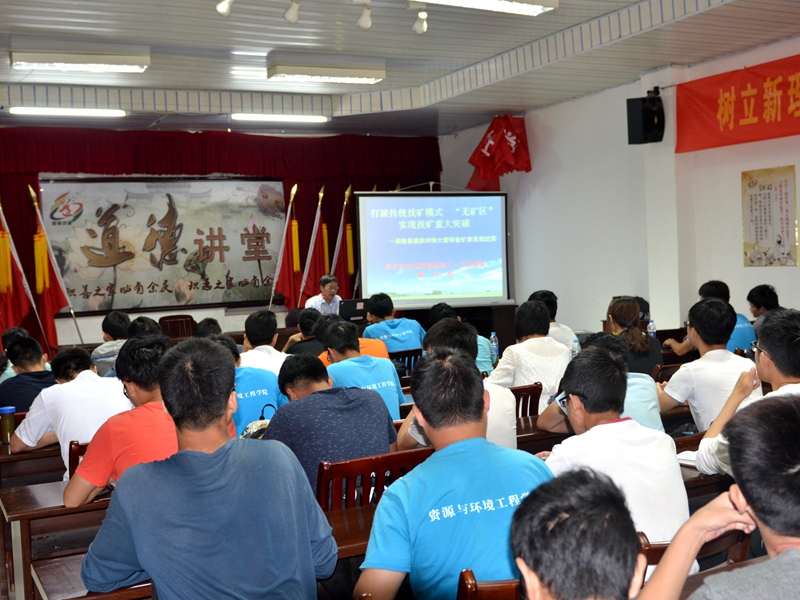 6月28日上午,局首席科技专家蒋其胜应合肥工业大学资源与环境学院邀请在队社区二楼会议室对60多名来队实习的大四学生进行了一场专题讲座。他以《打破传统找矿模式,“无矿区”实现重大找矿突破—南陵姚家岭特大型锌金多金属矿床发现纪实》为题,着重就南陵县姚家岭铜铅锌矿成矿规律以及发现该矿的找矿思路和立项、勘查发现及科学意义进行了全方位的讲授。随后师生们分别就姚家岭矿床成因及该矿成矿理论的贡献同蒋总进行互动交流,大学生向蒋专家提出各种地勘专业及就业问题,他都一一作答,现场气氛十分热烈。