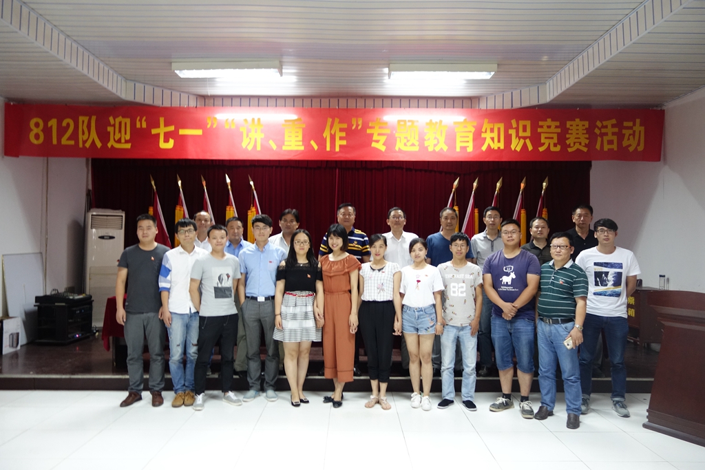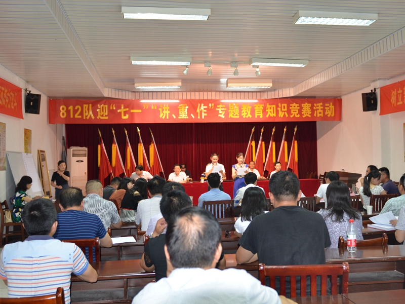 为庆祝建党96周年,进一步贯彻落实“两学一做”学习教育常态化制度化,6月29日下午,812队在社区二楼会议室一场“讲、重、作”教育知识竞赛活动,来自全队各部门12名职工参加活动,共有50多名党员干部职工现场观看比赛,接受了党的教育。