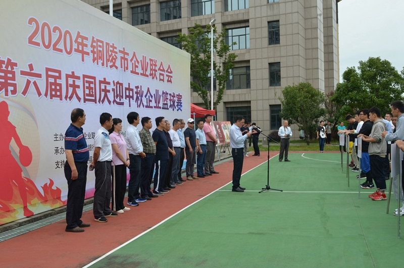 9月20日下午,铜陵市企业联合会第六届“庆国庆迎中秋”企业篮球赛在八一二队篮球场开赛。队长潘良玉作为市企联副会长,代表东道主和企业致辞。